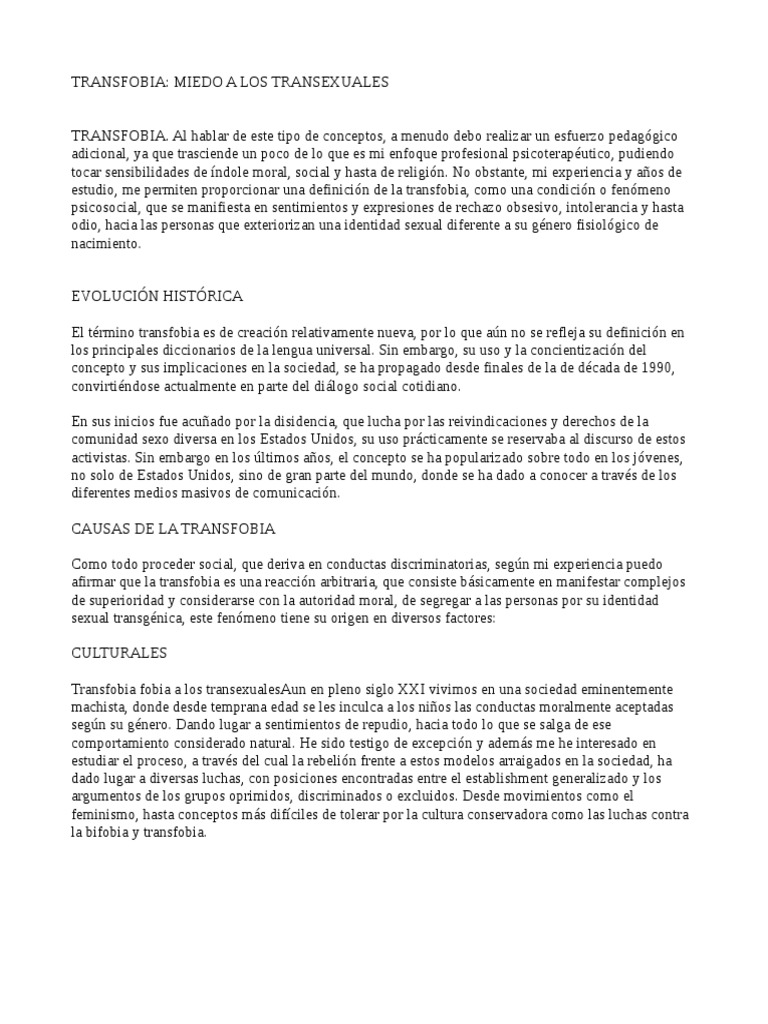 La transfobia es la aversión y rechazo que experiementa un individuo ante personas transexuales. La transfobia es una forma de discriminación hacia varias minorías que no se ajustan a los roles de género y que se ven como una amenaza contra la tradición. Todas las noticias sobre transfobia publicadas en el país. Además, las actitudes transfóbicas hacen que la población transgénero y de género diverso sean especialmente vulnerables a delitos de. Las personas que sufren transfobia.